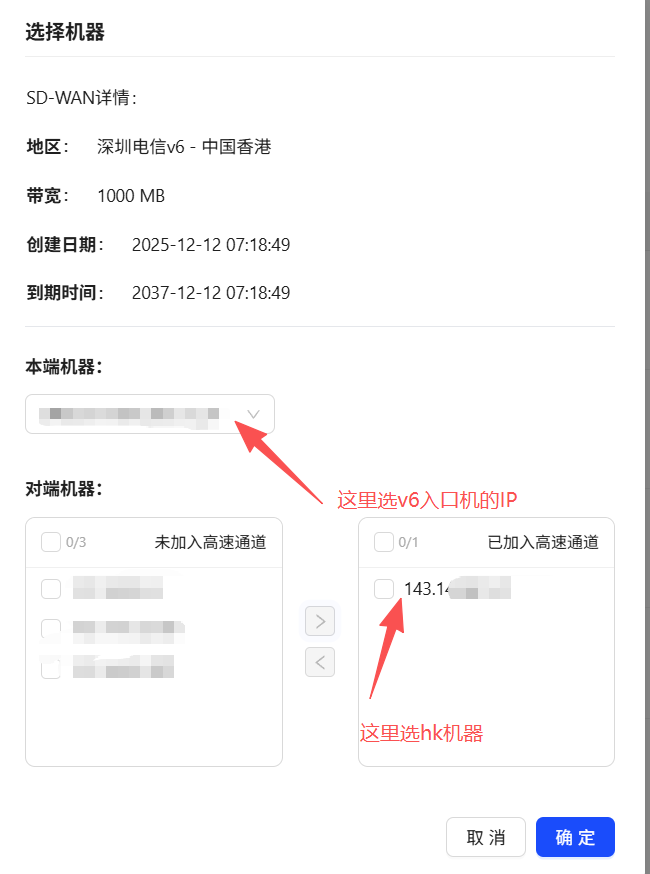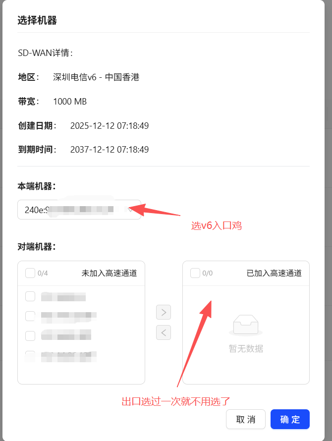 注:如果你有多个v6入口却只有一个hk出口的话,那么可以新建三个隧道,一个正常操作,剩下的直接只选择v6入口而不选择hk出口,类似这样