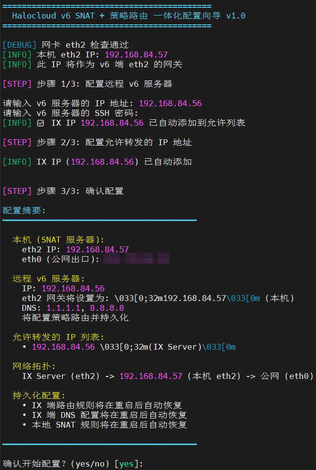 脚本会自动完成 SNAT、策略路由、DNS 等配置并输出如下信息(节选):